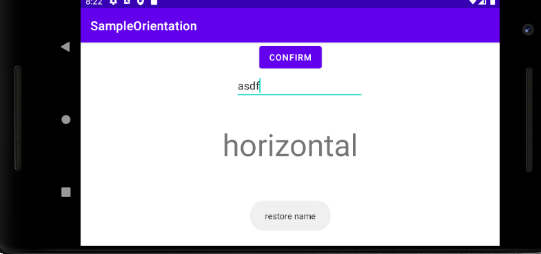 name 변수를 선언한 후, editText를 통해 글자를 입력하여 이 변수에 할당합니다. 단말 방향을 바꾸어 액티비티가 소멸되었다가 다시 만들어질때 onSaveinstanceState()메서드 안에서 name 변수의 값을 파라미터로 전달받은 Bundle 객체에 넣어줍니다. 이 객체는 onCreate 메서드가 호출될 때 파라미터로 전달됩니다. 그 이름은 위 코드에서 savedInstanceState라고 되어있으며 여기서 name 변수를 가져오면 데이터가 복구됩니다.